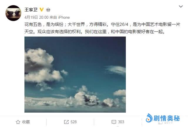 王家卫执导的电影在剧情都是十分精彩出众的,但是《撞死了一只羊》的排片占比仅为0.3%,这样的排片率实属罕见。因此王家卫还十分罕见的在微博上发言表示:请给文艺片一片天空,观众应该有选择的权利。但这也并没有让《一只羊》的排片数据有所提升。