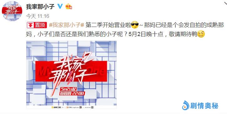 《我家那小子》官微在前段时间发宣布了这个好消息,还告诉大家那妈已经是个会自拍的成熟那妈了,而这档节目如今已经定当与5月2日每晚的十点钟播出,不得不说这个播出时间是真的很让人惊喜,因为在这之前都没有定档的消息传出,如今播出时间居然就在5月2号,没过多久大家就能观看节目了。
