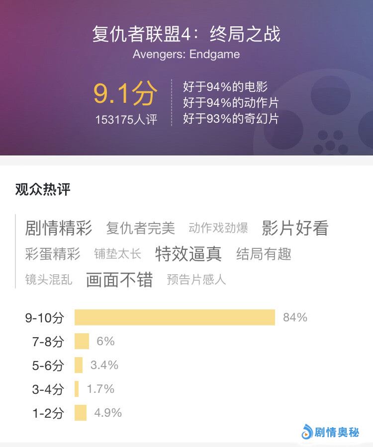 根据猫眼电影专业版数据显示,截至4月24日凌晨3点50分,《复仇者联盟4:终局之战》的评分高达9.1,共有约14万人参与评分,有82.7%的观众给出9-10分的好评分。女性观众似乎比男性观众更爱这部电影。