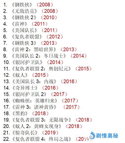 《钢铁侠》《无敌浩克》《美国队长》《雷神》《银河护卫队》《黑豹》《蚁人》《奇异博士》《蜘蛛侠》《惊奇队长》《复仇者联盟》。