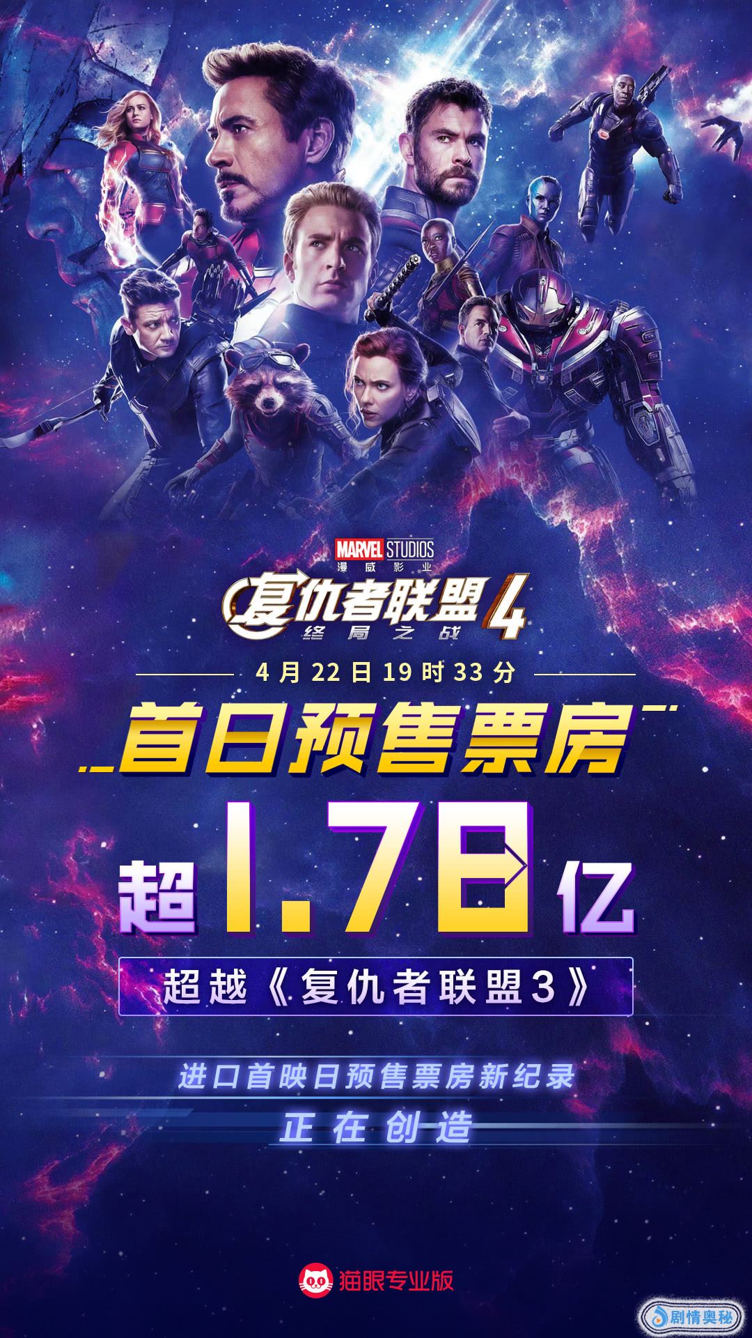影迷们翘首以盼的《复仇者联盟4》终于在4月24日上映了。零点场的票房达1.79亿,观影人次304.4万。首映日预售票房2.5亿,观影人次453.7万。首映日排片高达82.7%,刷新此前由《变形金刚3》保持了7年半的成绩,创造中国影史首映日排片新纪录。