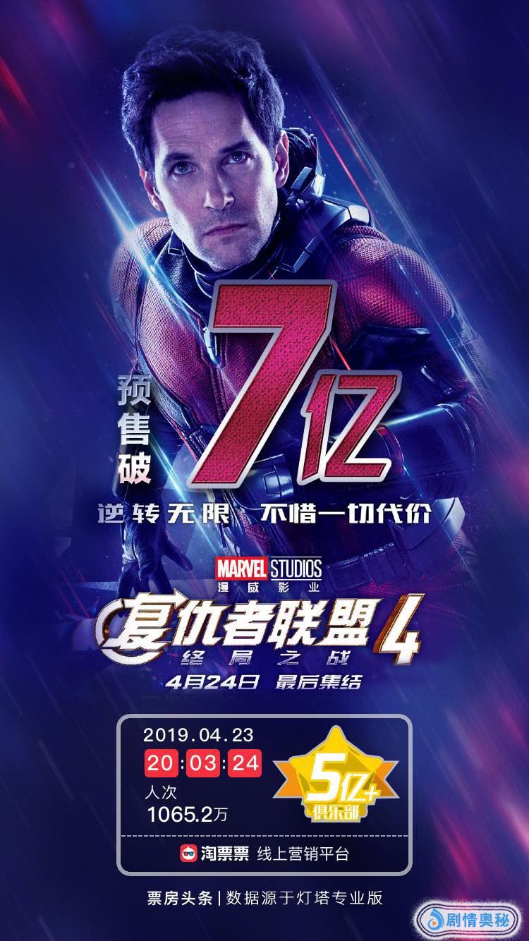 4月24日《复仇者联盟4:终局之战》内地上映,据灯塔数据显示,该片预售票房已于4月23日20:03分突破7亿元,创中国影史内地映前预售票房新纪录。