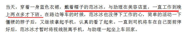 据摄影师透露说,范冰冰当天身穿蓝色连衣裙,戴帽子露面,和助理来到美容院熬夜工作,一直工作到凌晨亮点才彻底收工。范冰冰和助理在路边等车,范冰冰拿着手机盯着,玩手机,不知道在看什么内容。