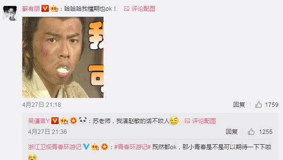 惊喜的是,吴谨言的表白喊话很快得到了正主苏有朋的回答。“哈哈哈我档期也ok!”后面还配上了一个曾阿牛可怜吃馒头的表情包,别提多可爱了。而为了不让张无忌一个人孤单,奶盐也用魏璎珞的表情包表示自己演的赵敏肯定不咬人。这算是一种保证?