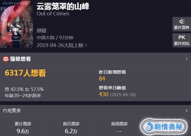 按目前的趋势来看,《云雾笼罩的山峰》最终票房不会超过100万,这样的成绩可谓彻底扑街了,又一部华语佳作被埋没,太可惜了!