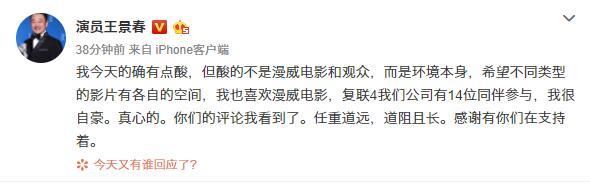 在被网友集体炮轰之后,王景春出来服软解释:“我今天的确有点酸,但酸的不是漫威电影和观众,而是环境本身,希望不同类型的影片有各自的空间,我也喜欢漫威电影,复联4我们公司有14位同伴参与,我很自豪。真心的。你们的评论我看到了。任重道远,道阻且长。感谢有你们在支持着。”