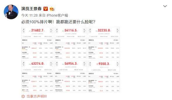 28日,凭借《地久天长》封柏林影帝的王景春,不满《复联4》的超高排片量,微博发文“酸”了一把:“必须100%排片啊!跪都跪还要什么脸呢?”该博文被网友diss,认为你自己的水平不到家,何必嘲讽别人的排片量,有市场需求才有排片,要搞清楚这个关系。