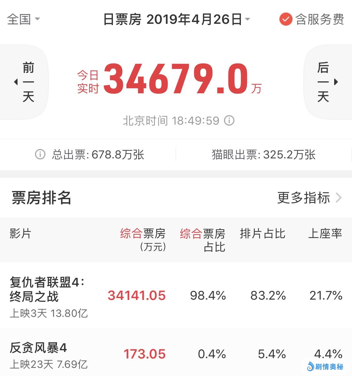 《复联4》如今上映3天总票房已经突破13.6亿!将其他同期上映的影片远远甩在身后,更可怕的是,《复联4》的单日综合票房占比高达98.4%左右,几乎是以“霸主”的身份占领了整个票房市场,足以证明这部好莱坞大片的魅力之大。