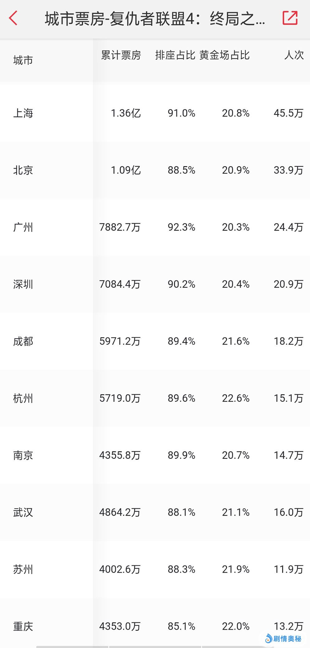根据猫眼专业版票房平台显示,截至4月27日上午10点,《复仇者联盟4:终局之战》的城市票房排名第一位的是上海,累计票房1.36亿;排名第二位的是北京,累计票房1.09亿,这也是票房贡献破亿的两个城市。第三到第十名依次是广州、深圳、成都、杭州、南京、武汉、苏州、重庆。