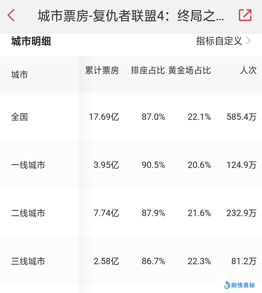 所以整体来看,喜欢《复仇者联盟4:终局之战》的绝大多数是二线城市的观众,贡献了7.74亿的票房,有232.9万人次观看,其次是一线城市,票房排座占比虽然最高,但是票房仅有二线城市的一半,为3.95亿,最少的是三线城市,不论是观看人次、排座占比还是票房都是最低的。