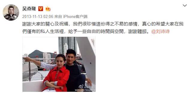 谁知道到了11月,吴奇隆和刘诗诗直接在微博上官宣这段恋情。