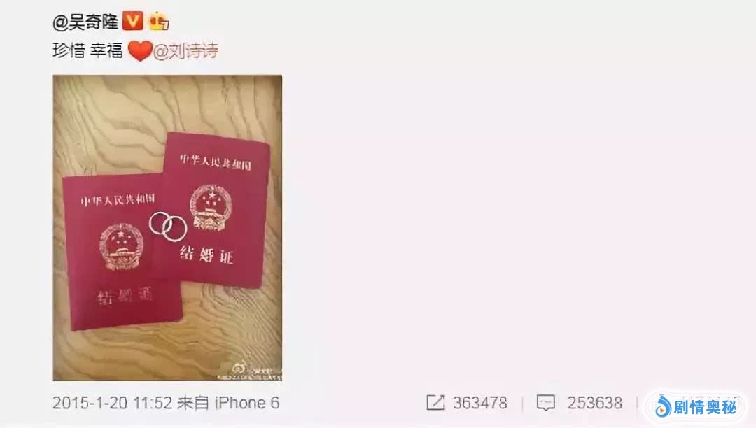 2015年1月20日,吴奇隆在微博po出结婚证,大方公布和刘诗诗领证结婚的喜讯。