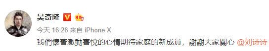 4月29日早,吴奇隆发微博宣布刘诗诗生子,他在微博写道“小朋友来报道,母子平安,谢谢大家关心!亲爱的妈咪辛苦啦。”并艾特刘诗诗说谢谢。接着刘诗诗马上转发微博说,小朋友超级可爱的。但并没有发出小朋友的照片。