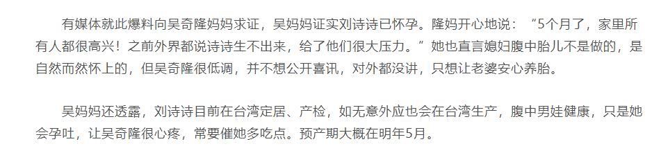吴奇隆妈妈接受采访时,更是直接爆出宝宝性别,原来刘诗诗肚子里的宝宝是男生,而且已经五个月了,预产期在5月份左右。