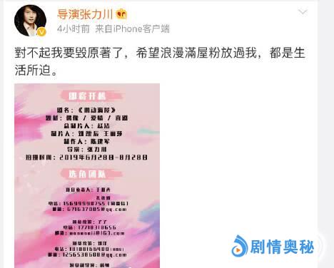 4月25日导演张力川接着在网上发文称:对不起我要毁原著了,希望浪漫满屋粉放过我,都是生活所迫。附图是开机信息,名称改为了《心动满屋》,还没有开机就开始求放过,导演不要怂啊,毕竟还是有网友对你有信心的。