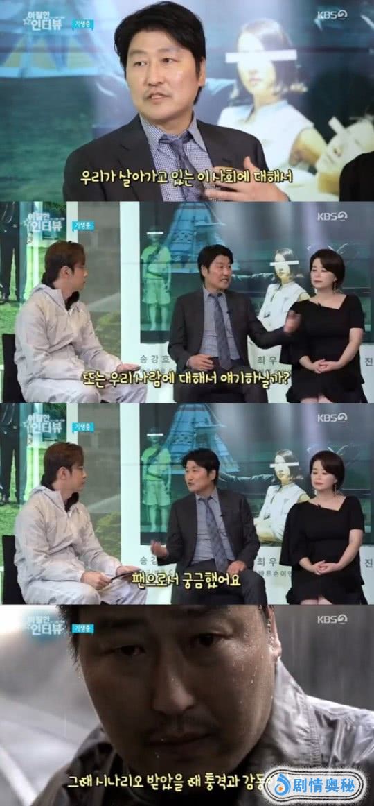 本月27日播出的KBS2综艺节目“我爱电影”的访谈环节中,《寄生虫》主演宋康昊、李善均、赵汝贞、崔宇植、朴素丹、张慧珍谈起了拍摄幕后故事。