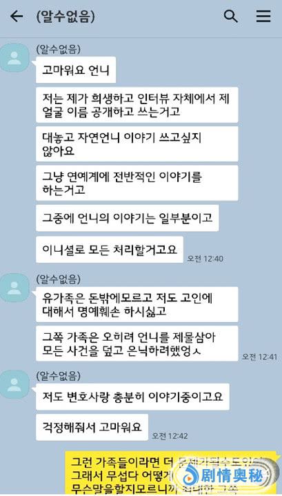 根据金秀敏作家公开的kakao talk截图,尹某表示:“(张紫妍)家人只知道钱,我也不想对故人进行名誉损害。(张紫妍的)家人反而想用姐姐做祭品,掩盖所有事件。”对此,金作家主张:“骂了张紫妍家人后,在电视台和媒体面前流着眼泪说为紫妍姐姐和遗属出书。看到这一点,我觉得应该和她断绝关系。”