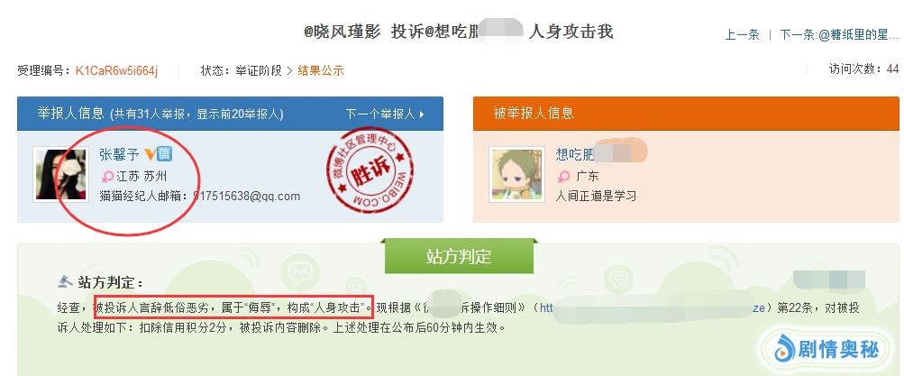 张馨予投诉举报网友后,站方判定张馨予胜诉,认定被投诉人言辞低俗恶劣,属于侮辱内容,构成人身攻击,因此直接删除了被投诉的内容。这已经不是张馨予第一次举报投诉网友了,看到负面评价时,她经常亲自去举报,竭尽全力维护自己的名誉权。