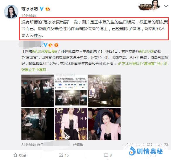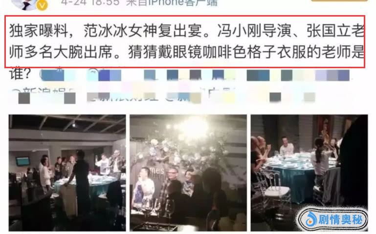 范冰冰方澄清说:没有所谓的“范冰冰复出宴”一说,图片是王中磊先生的生日饭局,很正常的朋友聚会而已。原偷拍及未经过允许而编撰传播的博主,已经删除了微博,网络时代不要人云亦云。