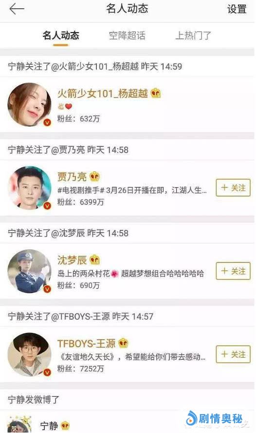 网友去了宁静的微博,意外的发现了宁静竟然取消对杨超越和王源的关注~之前还是几个人都在关注着,但现在只剩下金瀚还有贾乃亮了。可能是在一起录制《哈哈农夫》的时候,王源和杨超越的头脑都比较简单,没有做到让宁静比较满意的地方,所以导致录完节目后,宁静就把两个人都取消关注了。要说这宁静还真的就是“真性情”呢,无论是面对谁,无论对方是年纪大的还是年纪小的,只要是我看不惯你,那我就要做出相应的措施~就是不知道王源和杨超越知不知道,如果知道了会做出什么样的回应呢?