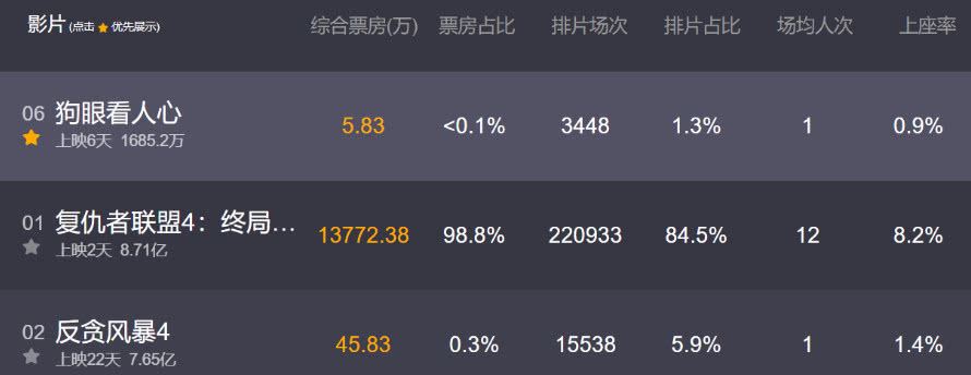 《狗眼看人心》在4月20号上映,当时市场上所有的目光都被没有上映的《复联4》吸引,超高的票房也让不少影迷准备近期就看《复联4》一部大片了。因此《狗眼看人心》虽然明星云集,但首日票房只有642万,之后一路下跌,截至目前累计票房只有1685万!