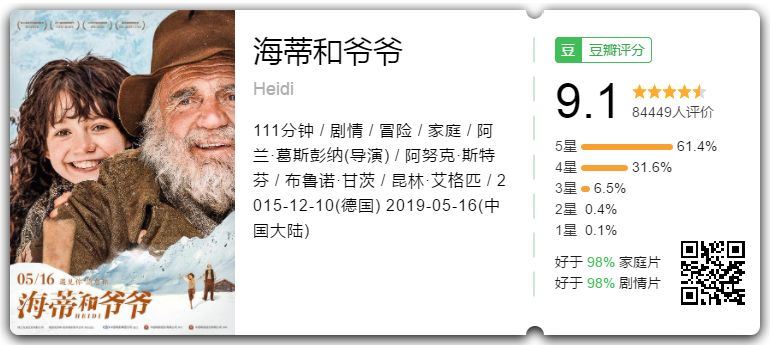 影片取材自瑞典畅销小说《海蒂》,此前影视改编作品有秀兰·邓波儿版《海蒂》和吉卜力动画《阿尔卑斯山的少女》,这回也相当成功,爷孙情贡献满满泪点。