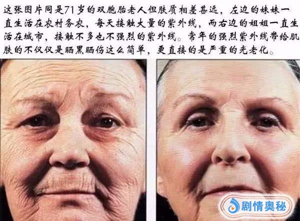 美国一对双胞胎姐妹,分别生活在紫外线强烈的乡村和紫外线弱的城市,等到姐妹俩71岁的时候,视觉年龄差了十岁以上!