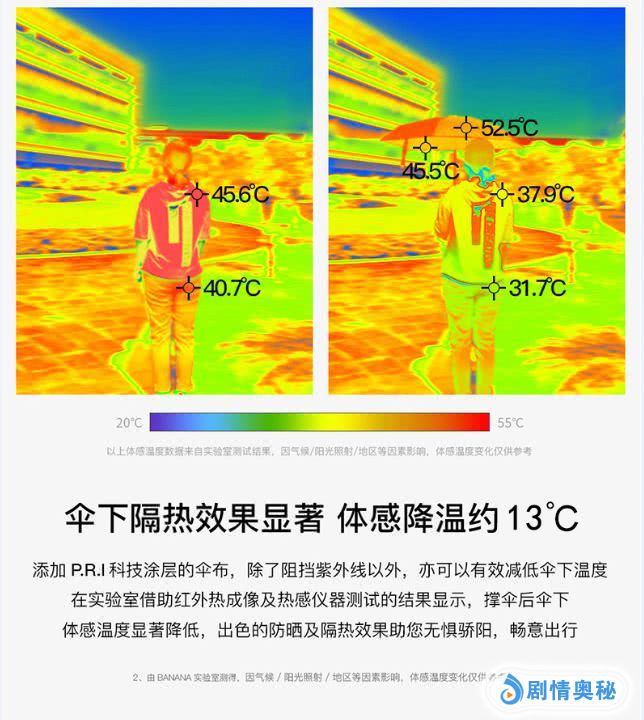 我们在室外进行了红外热成像和热感仪器测试,对比发现,撑着口袋伞,体感温度降温约13℃!