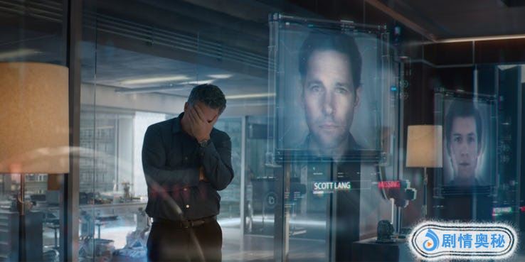 我们在预告片中看到,布鲁斯·班纳看着遇难者的照片以手扶头。虽然电影中确实有复仇者们看着屏幕的场景,但却没有这个镜头。
