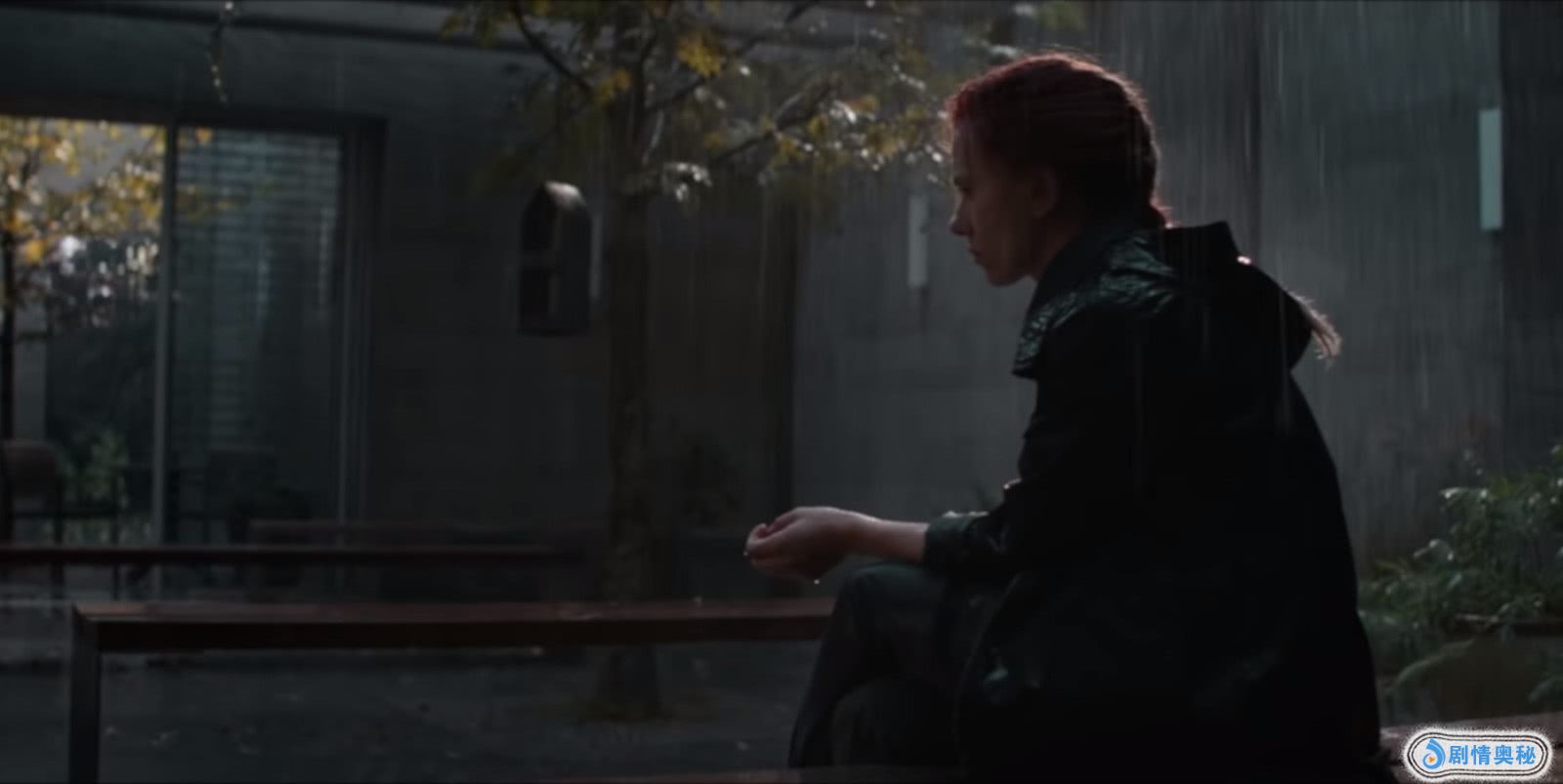《复仇者联盟4:终局之战》的预告片里有一个黑寡妇坐在雨中的镜头(日本),显得悲伤而孤独。尽管正片里有寡姐和鹰眼在日本的镜头,下雨的场景也有,但没有这个场景。