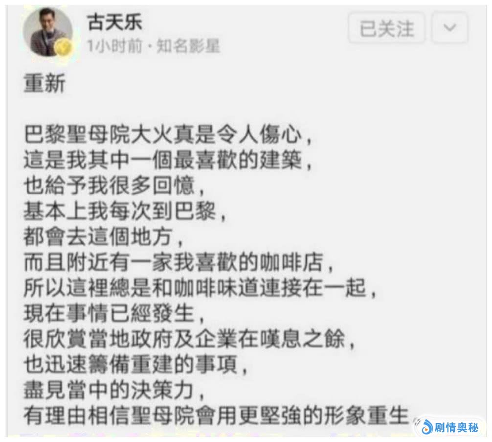 不过娱乐圈里面还有一位明星在为巴黎圣母院发文之后,没有遭到网友的如此对待,他就是古天乐。