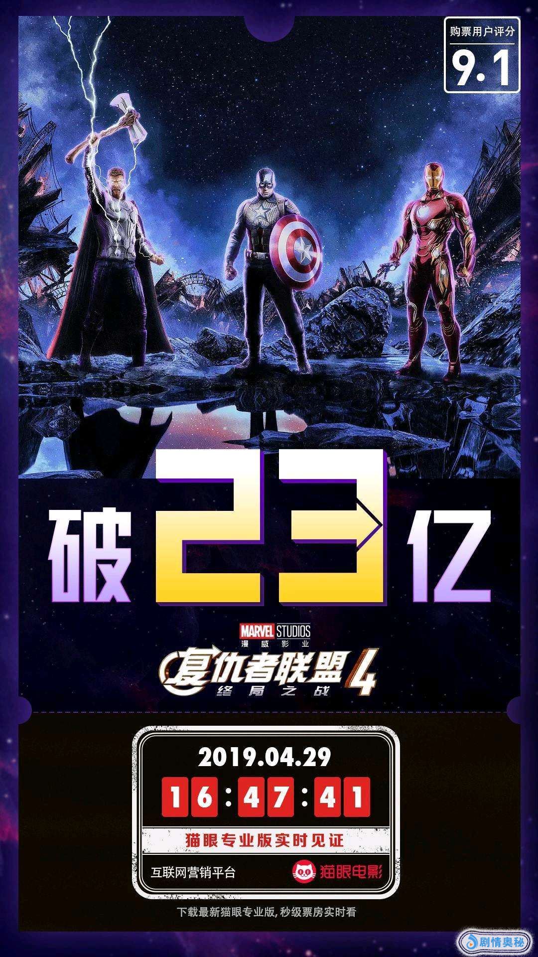 根据猫眼专业版票房平台显示,截至4月29日16点47分,《复仇者联盟4:终局之战》的票房已经突破了23亿,并且该片已经连续6天成为单日票房冠军。