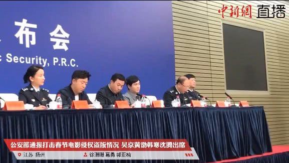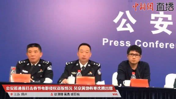 4月29日,公安部在江苏扬州召开“2·15”春节档电影侵权盗版系列案件新闻发布会,演员吴京、黄渤、沈腾,导演韩寒出席了发布会。