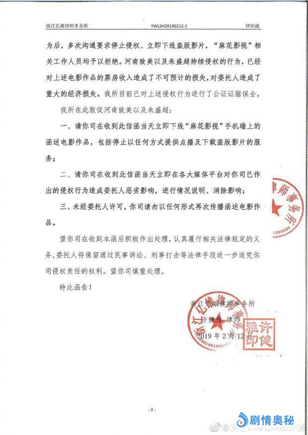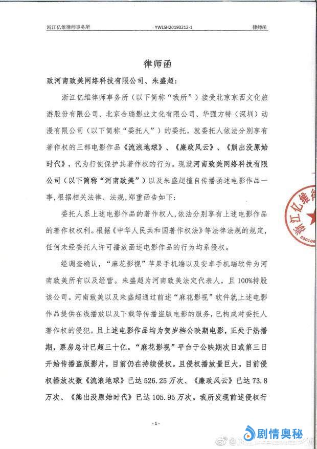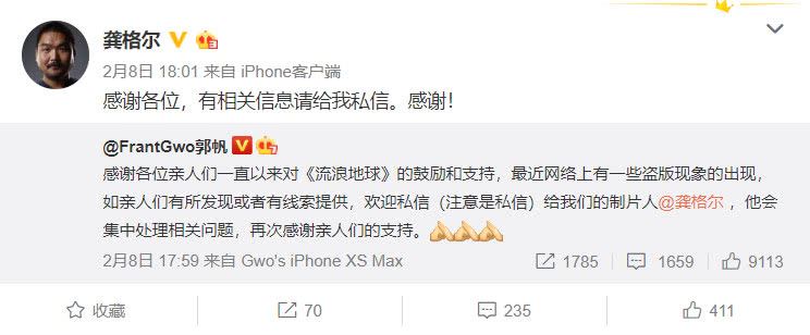 其实在今年的2月12日,《流浪地球》《廉政风云》《熊出没·原始时代》三部影片就发布了联合声明,向涉嫌盗版的手机端软件“麻花影视”发送律师函,敦促对方停止侵权,要求对盗版资源进行下线处理。《流浪地球》的导演郭帆和制片人龚格尔也都在微博上呼吁网友抵制及举报盗版。如今,经过公安机关的精准打击,春节档电影高清盗版制作源头被铲除,院线电影盗版问题得到了有效遏制。