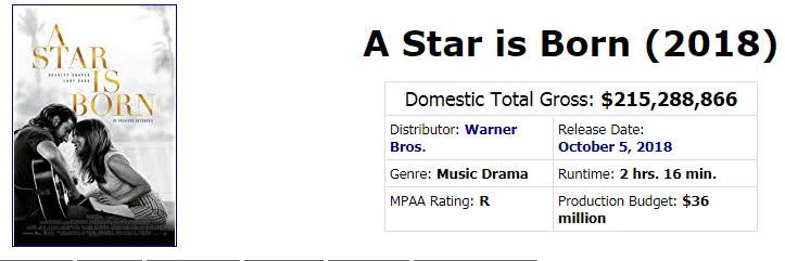 作为音乐电影,《一个明星的诞生》受众有限,不过凭借两位主演巨大影响力以及出色电影品质,照样实现了票房大卖,北美票房破2.1亿美金,完全称得上”年度票房黑马“