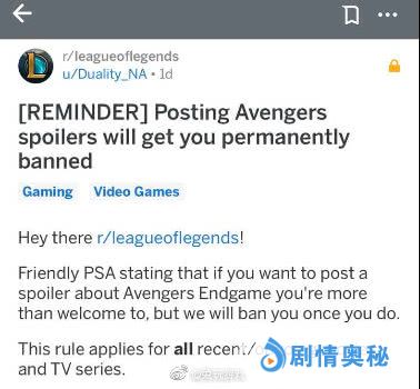 英雄联盟官方账号发布消息称,如果在游戏过程中剧透了《复联4》和《权力的游戏》第八季的话,会被进行三天封号的处罚。