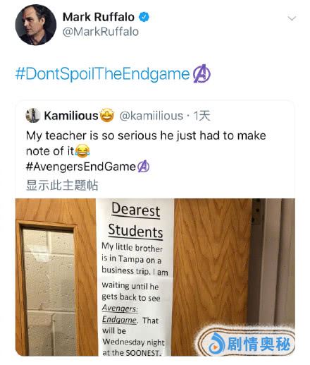 还有一位老师在教室门口贴上纸条,让学生们不要剧透直到自己的看完《复联4》。绿巨人也转发支持。