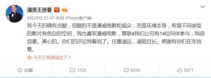 王景春怒斥《复联4》高排片,随后发文表示“自己有点酸”