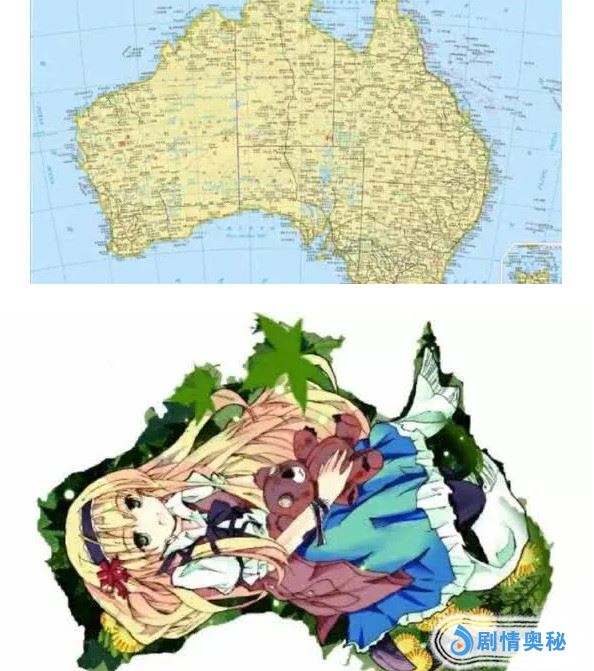 澳大利亚的造型看起来也是比较独特的,所以在创建美人的时候,只能是把它横过来才能看清楚造型,是一个黄头发的美少女,手上还抱着一个小熊,也不得不佩服他们的一个脑洞之大