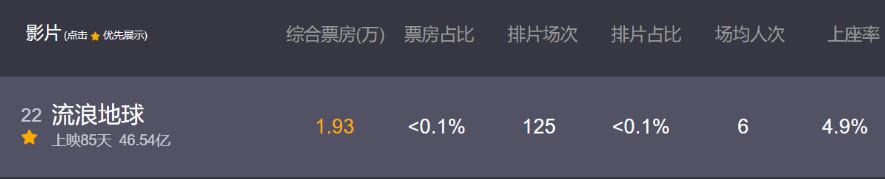 在《复联4》的强势下,国产片基本上都是缴械投降。更别说上映了85天的《流浪地球》这部“老电影”了,4月30号《流浪地球》日票房下降到了1.93万,排片小于0.1%。