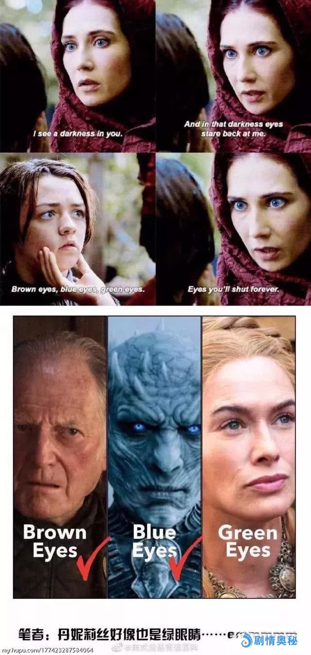 棕色眼睛的弗雷已经被杀,蓝眼睛的夜王也在这集被艾丽娅一刀化为碎冰,那么绿眼睛的是谁呢?