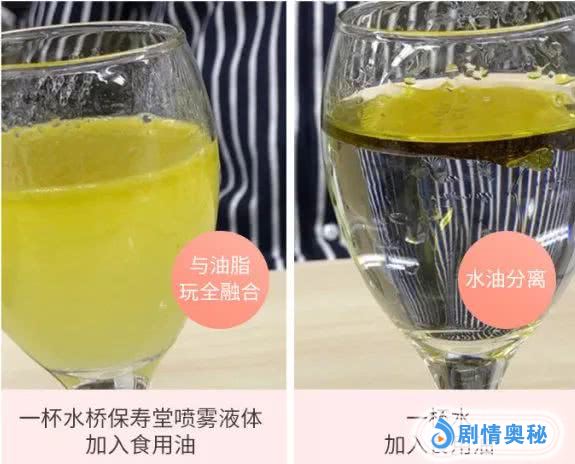 下面这张图片是把同样的油倒入清水和水桥保寿堂中的对比图,可以看出水桥保寿堂喷雾和油脂融合,溶解油脂能力强