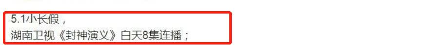 《封神演义》的爆火,可以说是意外中的意外,在10点场收视还能达到1点多。可见,该剧有多少宝宝在追。于是,湖南台趁热追击。更改了播放的方式,从5月1日起。白天8集联播。当初知否也是这个套路。为了就是给那些平时没有时间的人,小长假休息时连着看,同时,乘着火热增加收视。可以说是套路满满啊。