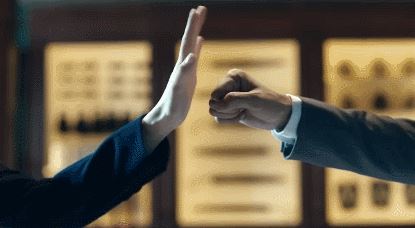 而在和罗志祥的一番对话中,我们也能看到她和小猪的对话高深得很。要不是两人正襟危坐地你一言我一语,大家差点就要忘了他们的搞笑本质了。互相客套完后的两人站起来击掌。没想到一个伸出聚财大手,另一个蹦出个小拳拳。画风不同,也没办法加油打气。互相退让后依旧不在线上。热血的基调秒变搞笑向,让人忍不住乐呵起来。