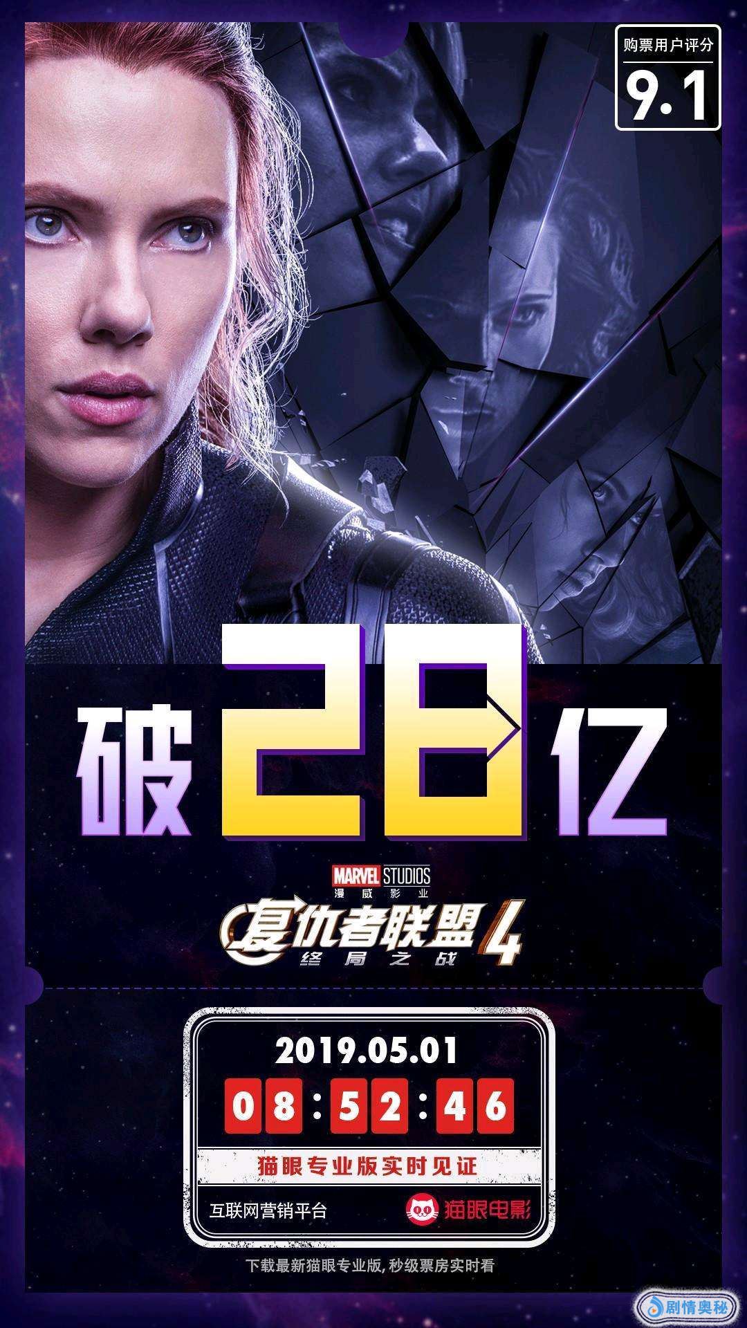 根据猫眼专业版票房平台显示,截至5月1日8点52分,《复仇者联盟4:终局之战》的票房已经突破了28亿,并且该片已经连续7天成为单日票房冠军。