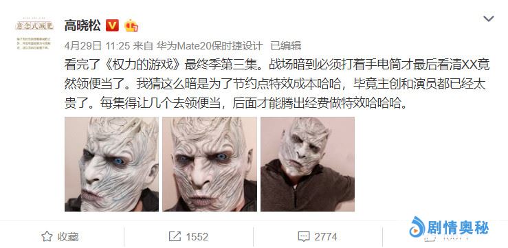 4月29日,高晓松也发微博吐槽:“看完了《权力的游戏》最终季第三集。战场暗到必须打着手电筒才最后看清XX竟然领便当了。我猜这么暗是为了节约点特效成本哈哈,毕竟主创和演员都已经太贵了。每集得让几个去领便当,后面才能腾出经费做特效哈哈哈。 ”