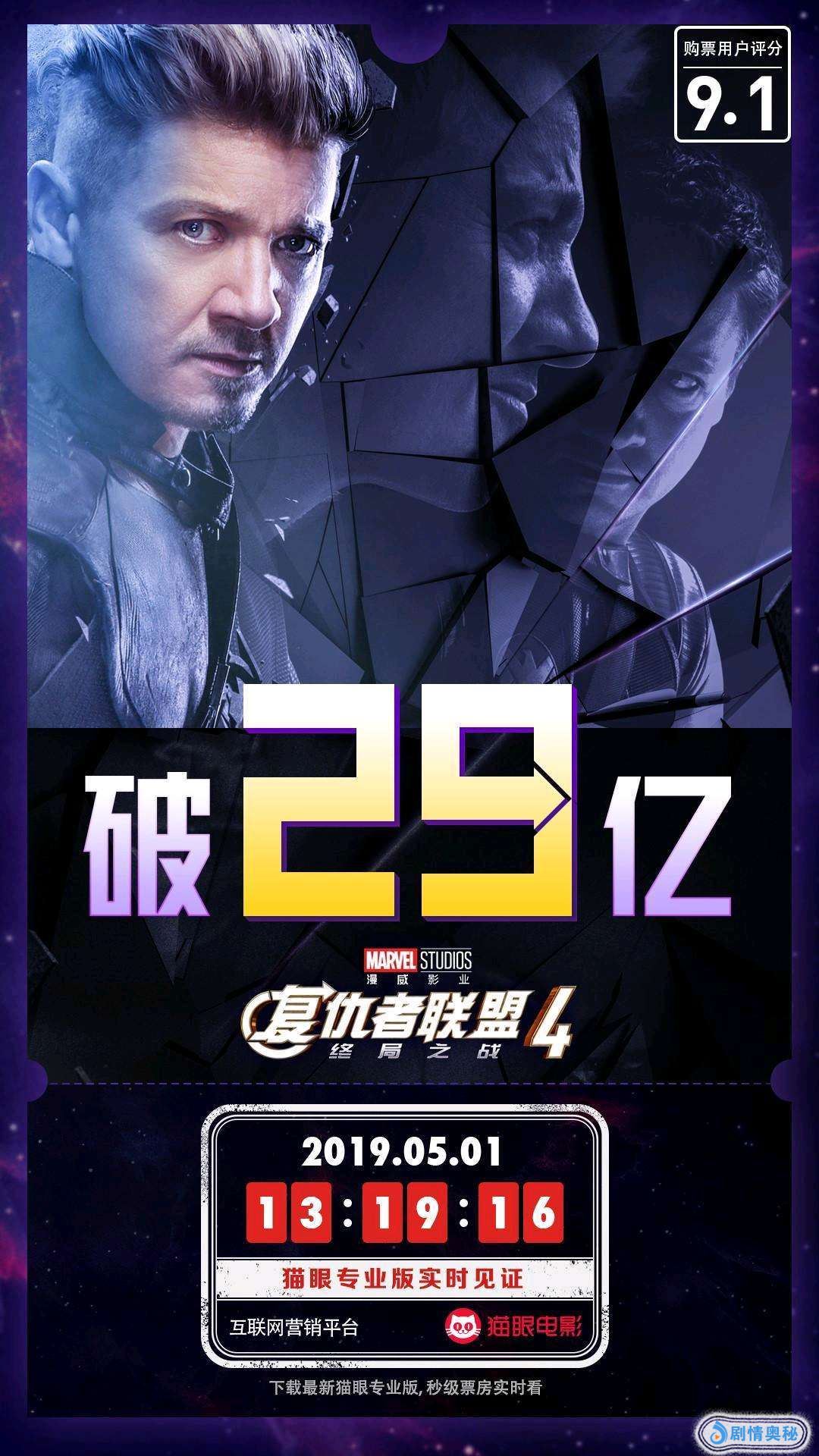 根据猫眼专业版票房平台显示,截至5月1日13点19分,《复仇者联盟4:终局之战》的票房已经突破了29亿,并且该片已经连续7天成为单日票房冠军。