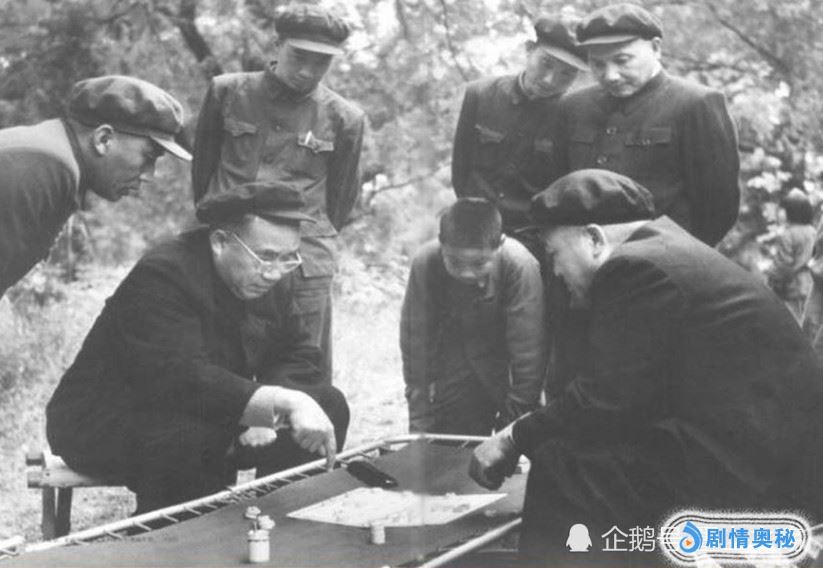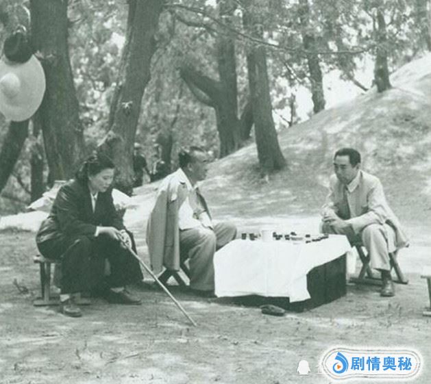 朱德与周恩来在北京明十三陵下棋,康克清在一边作陪。