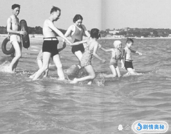 刘少奇夫妇带着孩子们在北戴河游泳。
