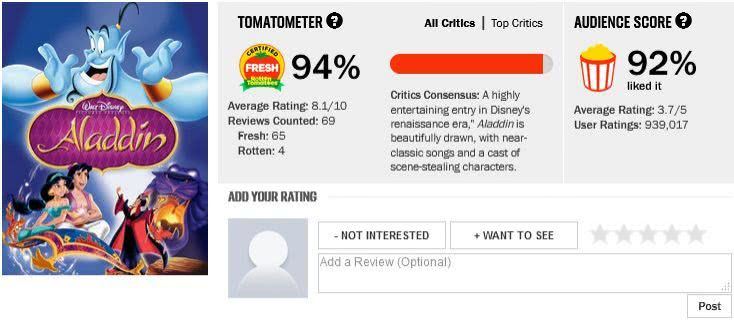 原版阿拉丁动画,是一部烂番茄新鲜度高达94%的神作。